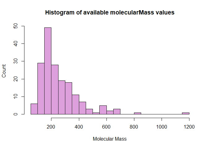 We can now iterate through the list of CAS RNs to store data about the chemicals. In this example we extract a list of molecularMass values and visualize them.