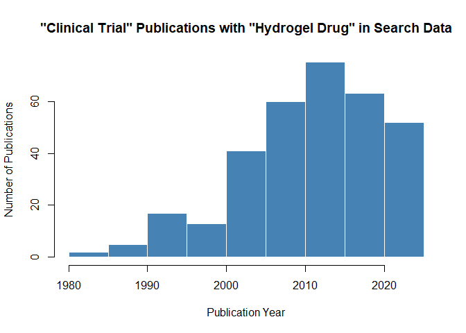 main = "\"Clinical Trial\" Publications with \"Hydrogel Drug\" in Search Data",