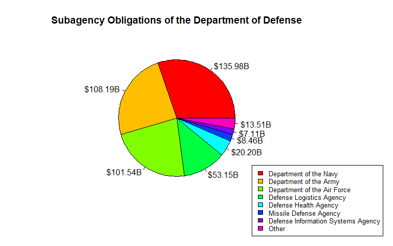 The toptier_codes mapping we created above contains every agency name in the API. For this example, we’ll look at the total obligations of each subagency of the Department of Defense.